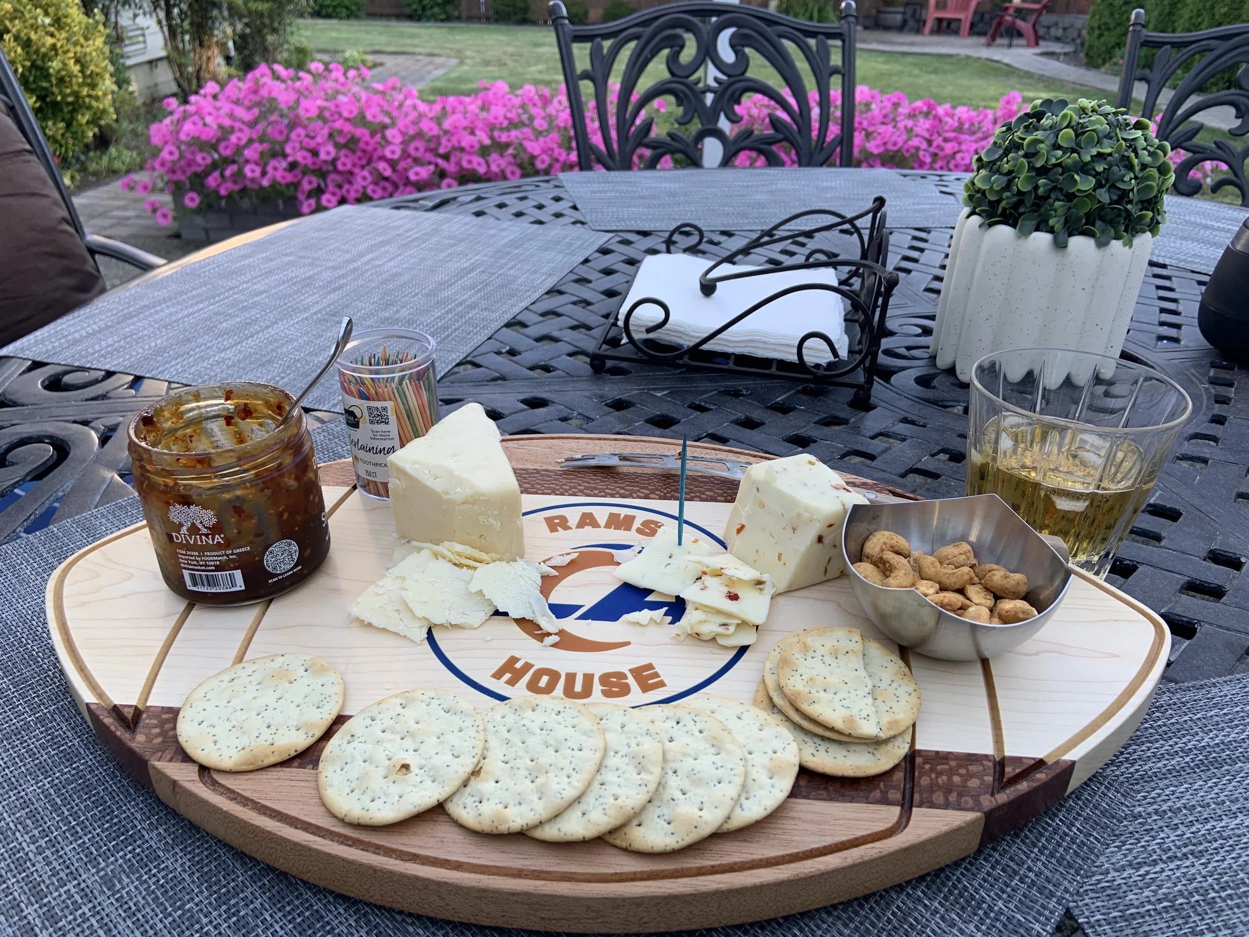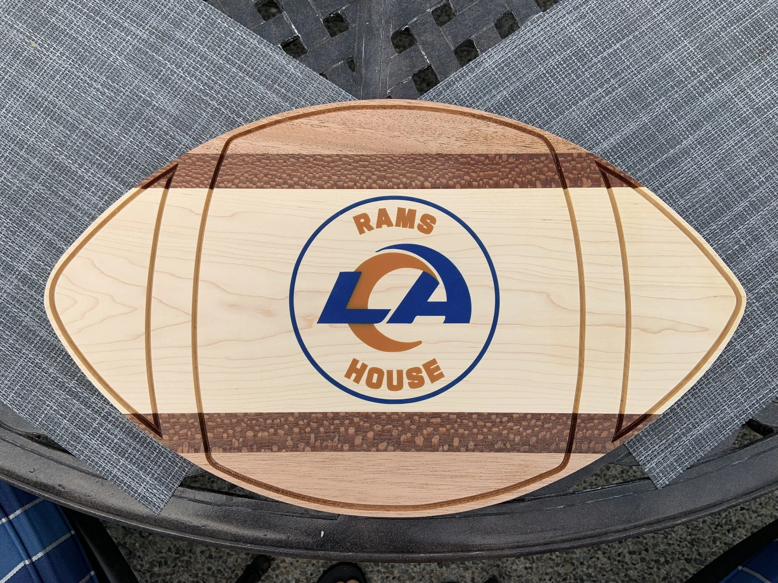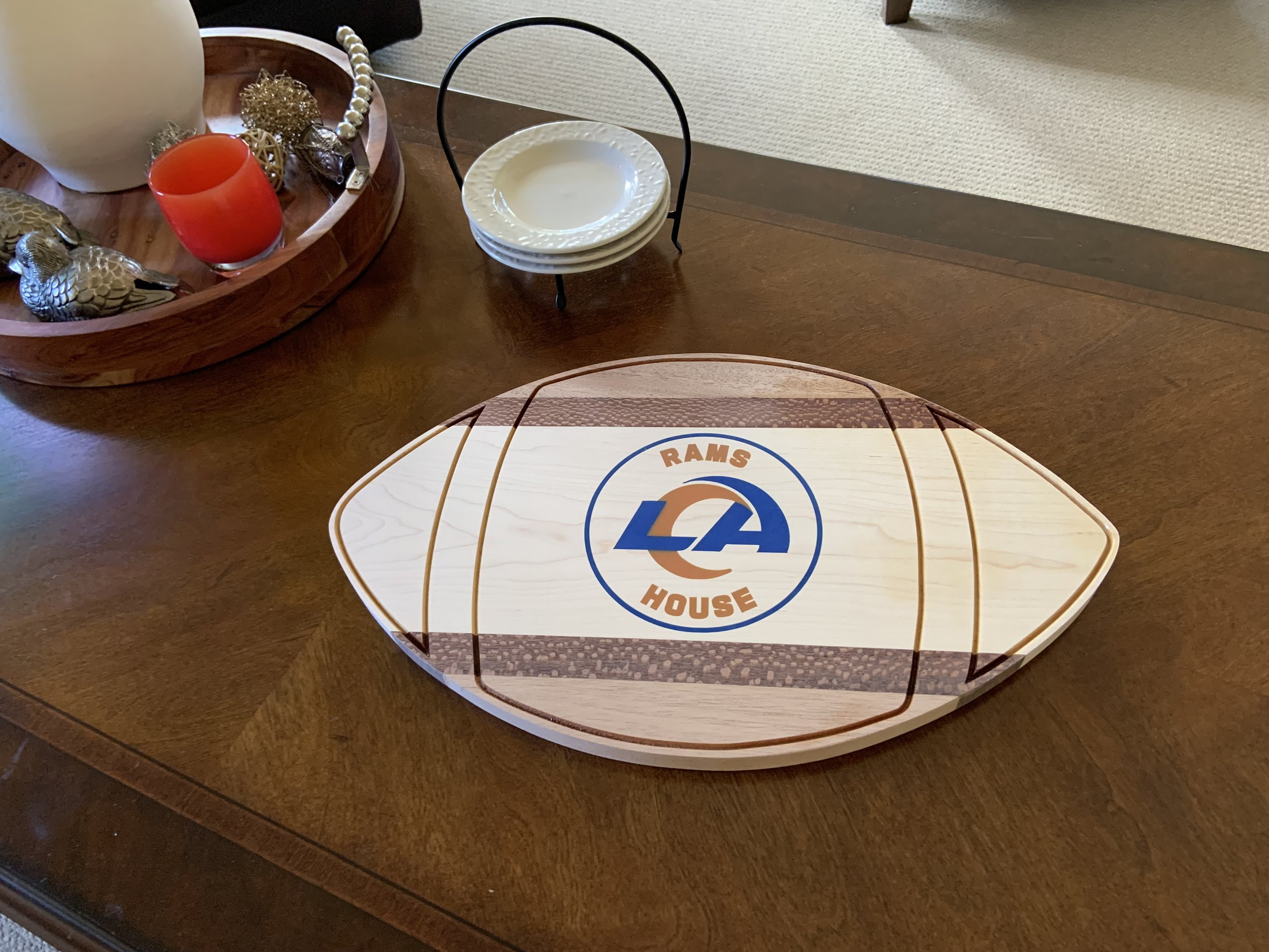 Design 12 is a football shaped board (19” X 11.5”) with an epoxy in-lay of LA RAMS logo. It is composed of the following wood types: Maple, Brazilian Lacewood, African Mahogany