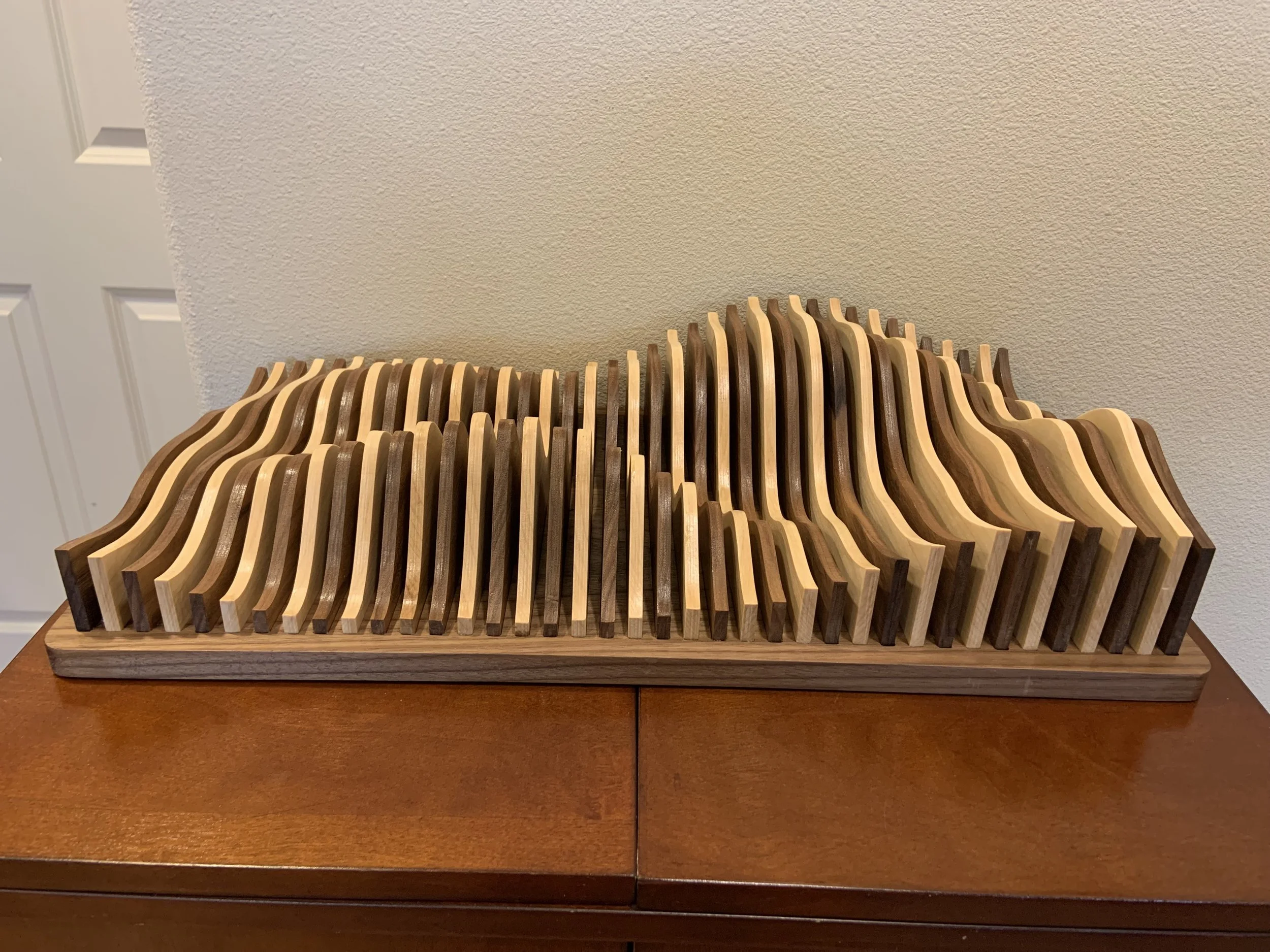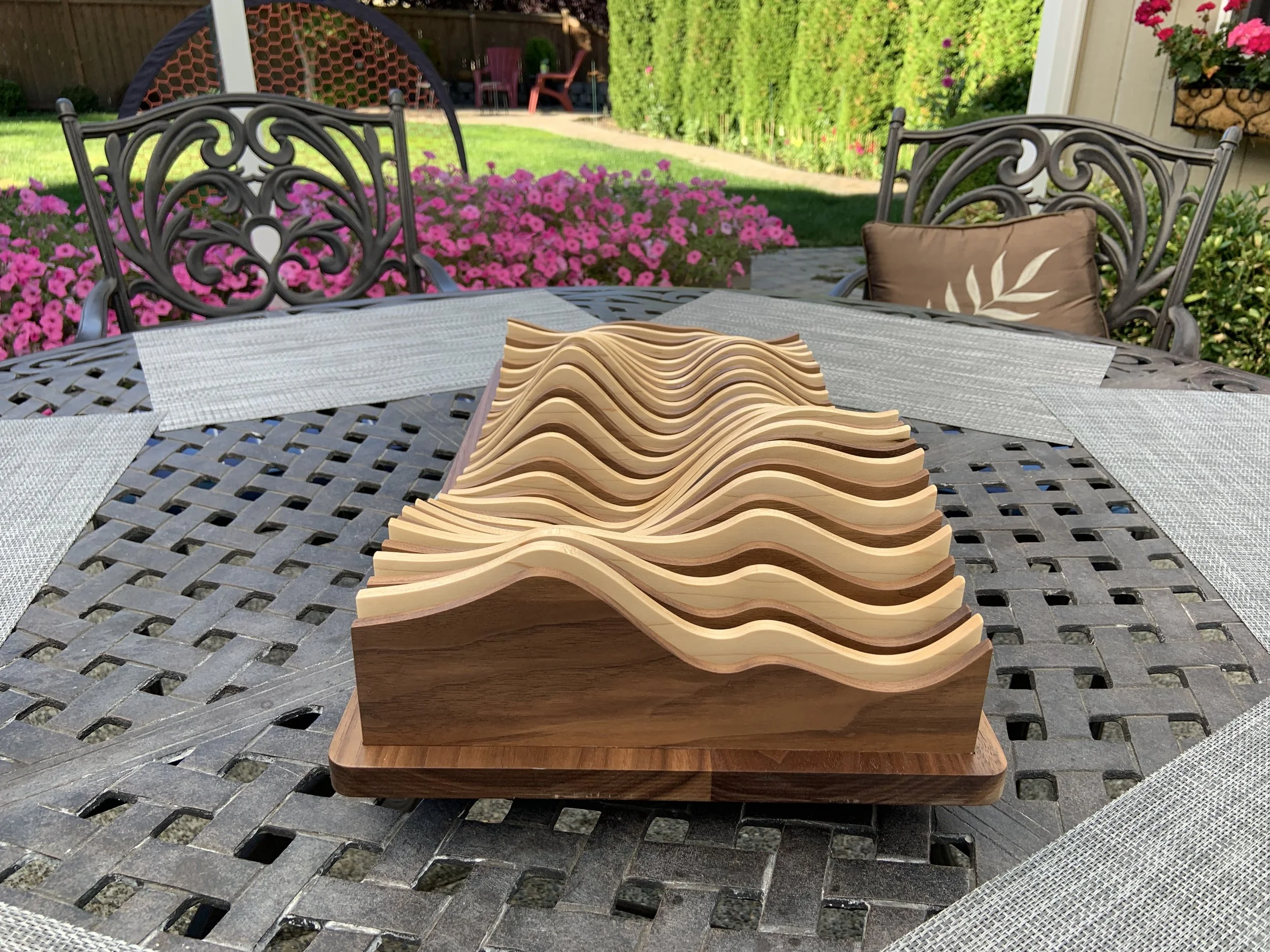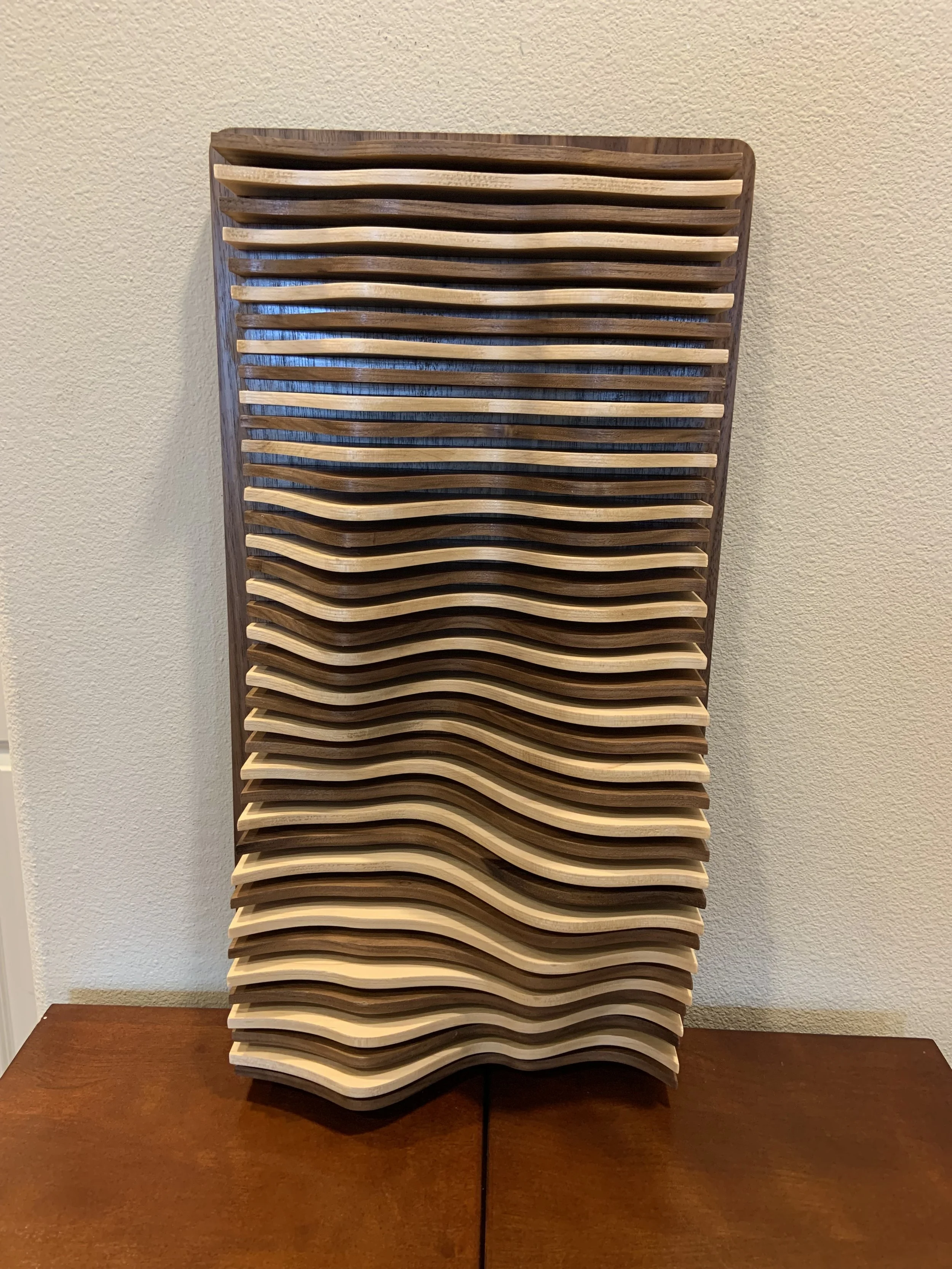 This is our first design of a wood art made using parametric algorithmic design. This design showcases the contrasting colors of maple and walnut hardwoods. The wave design focuses on the sense of flowing movement and the organic shape.