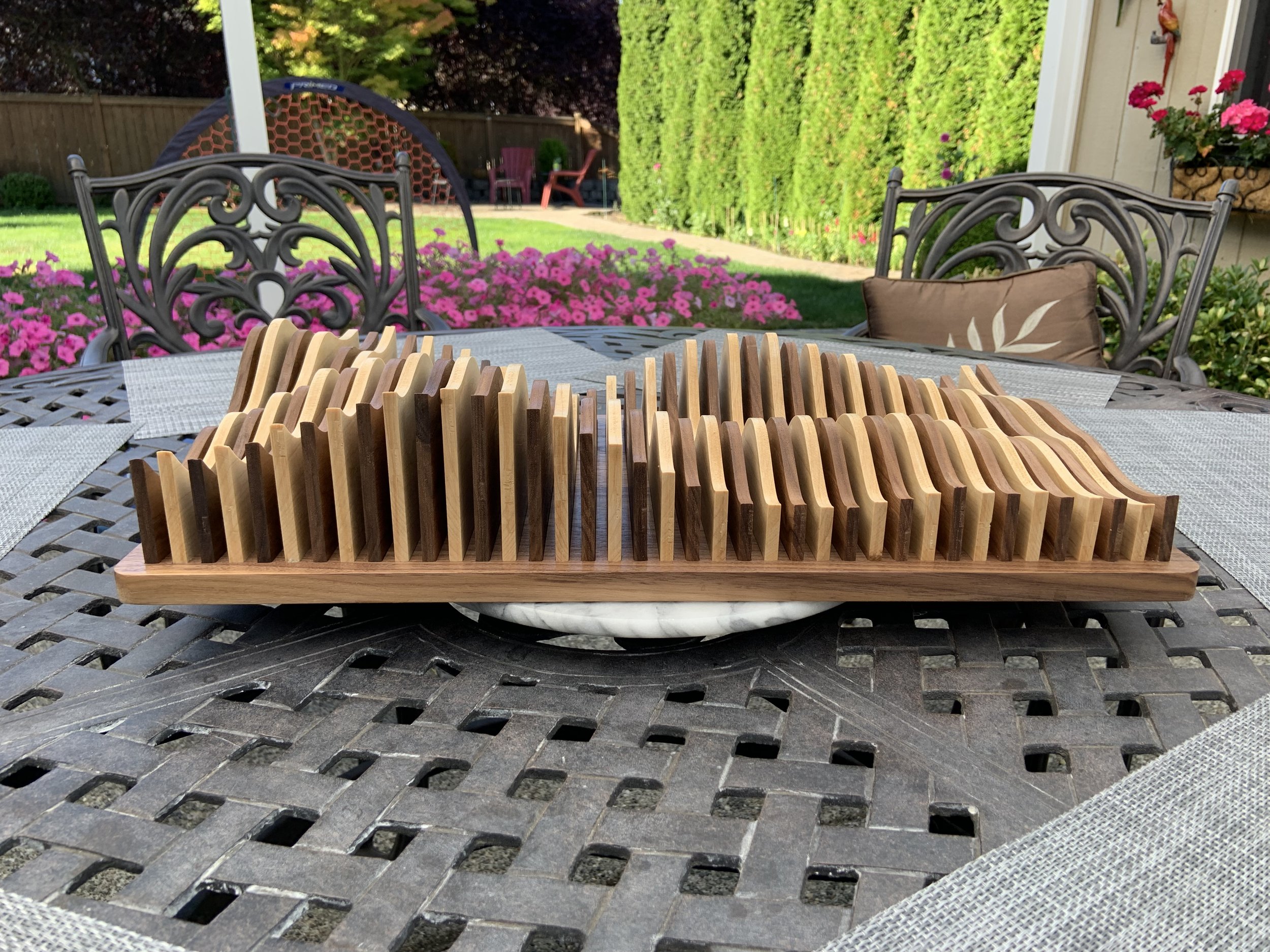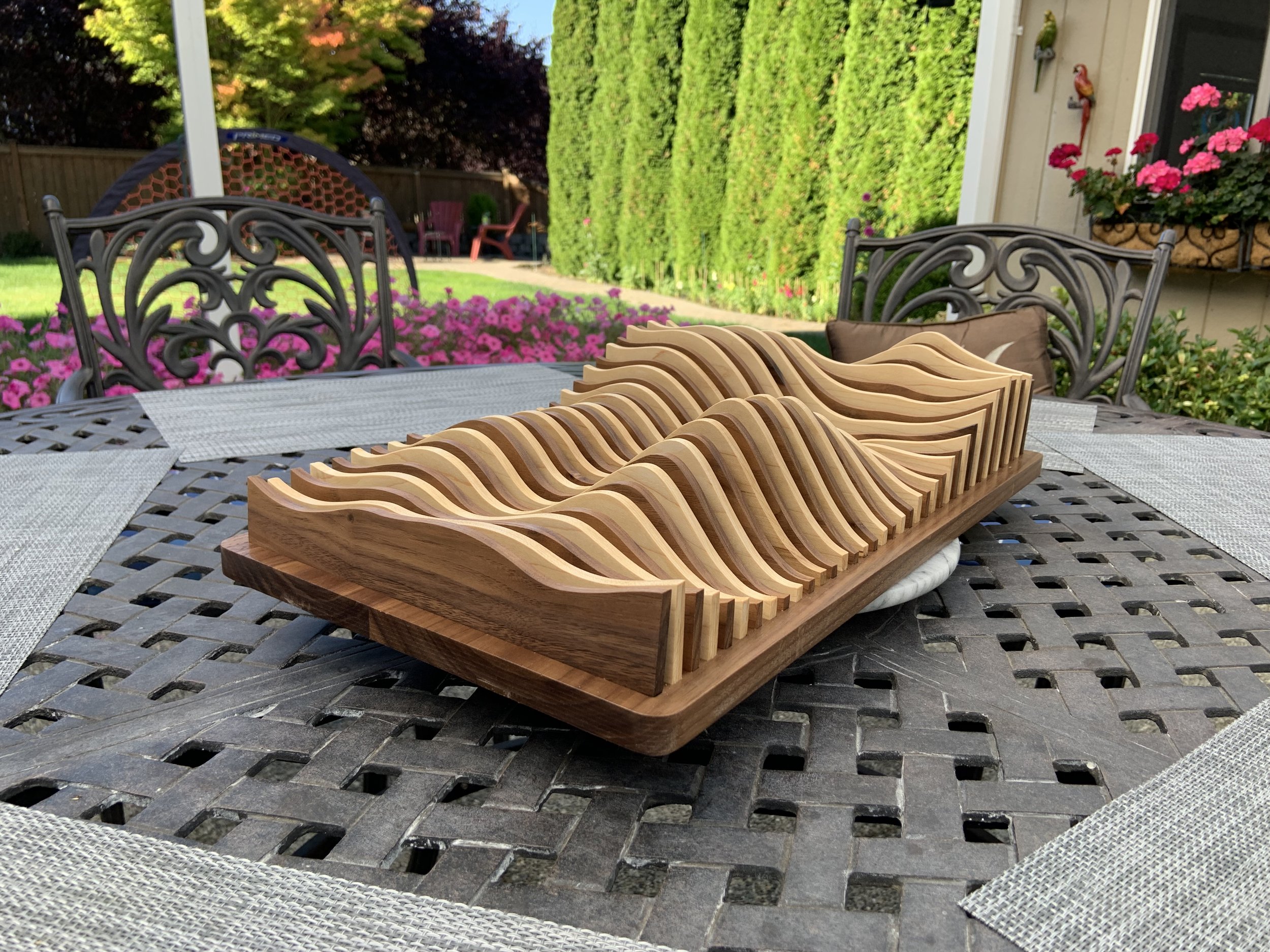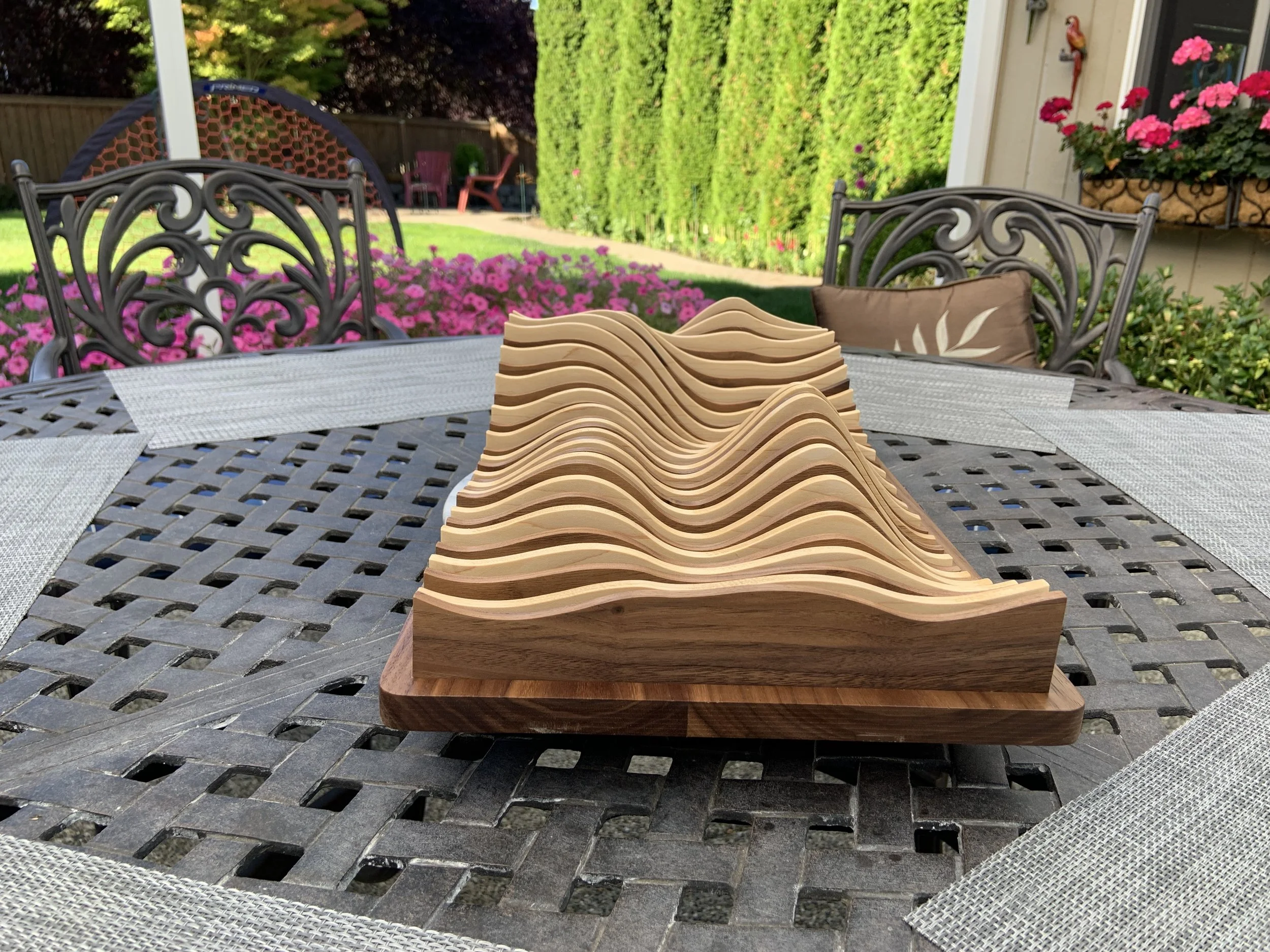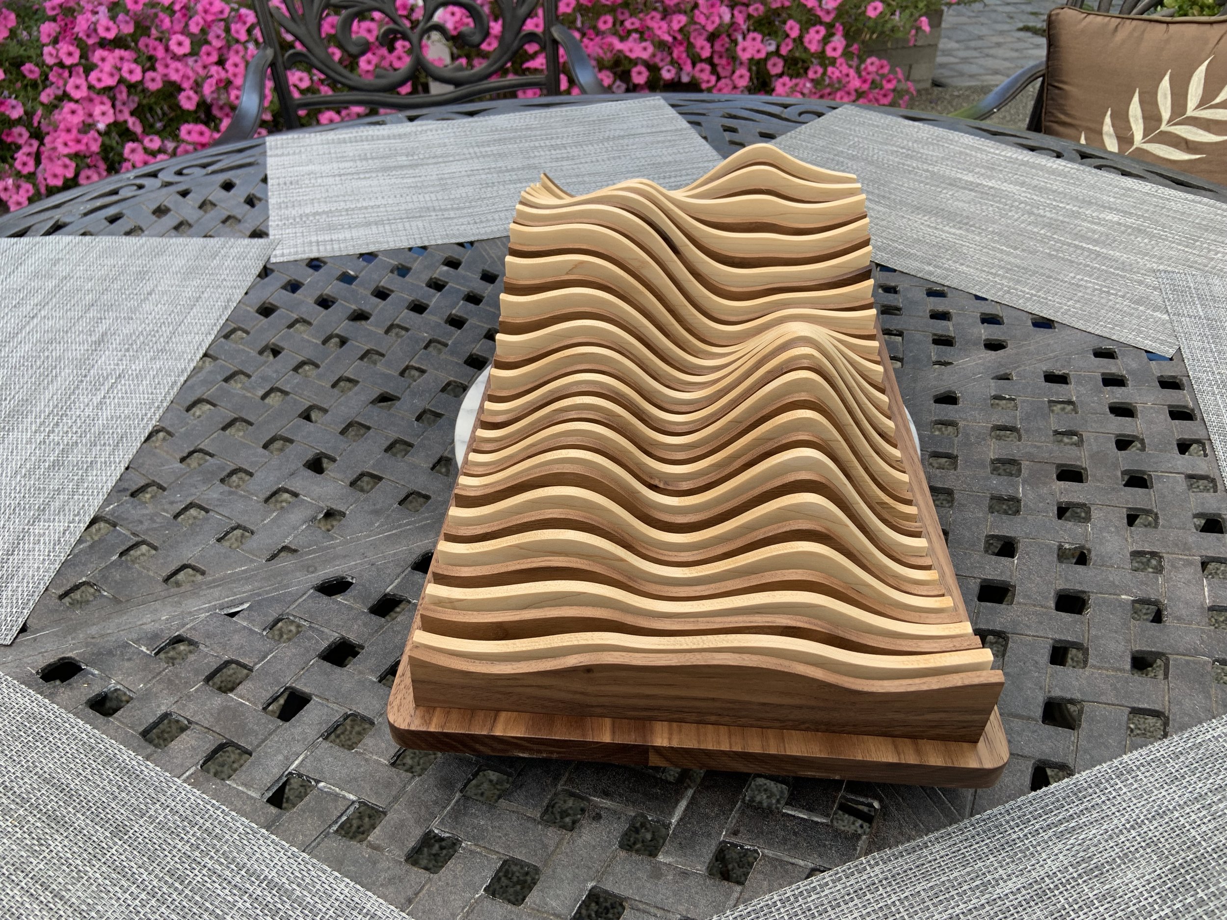 This is our first design of a wood art made using parametric algorithmic design. This design showcases the contrasting colors of maple and walnut hardwoods. The wave design focuses on the sense of flowing movement and the organic shape.