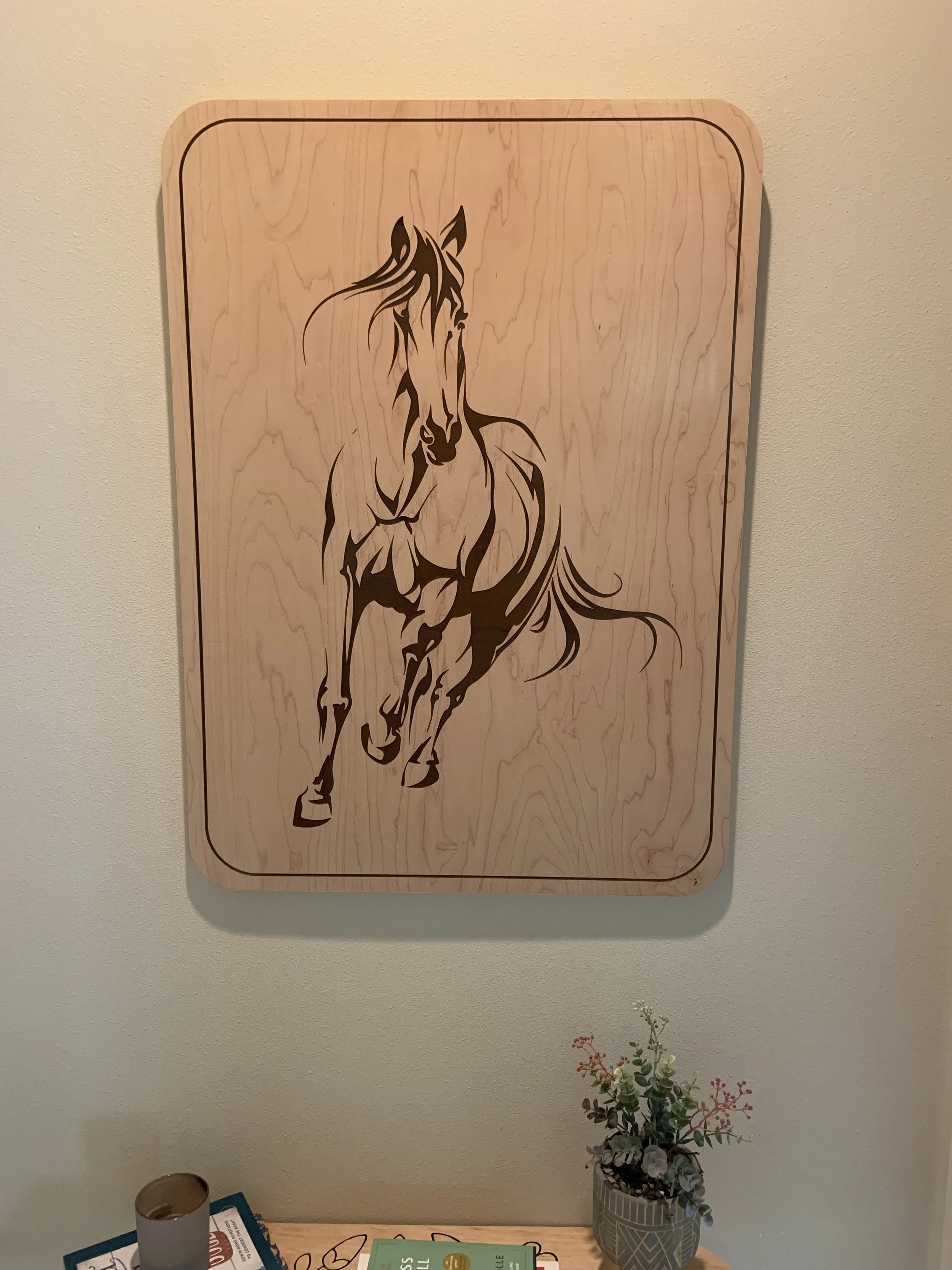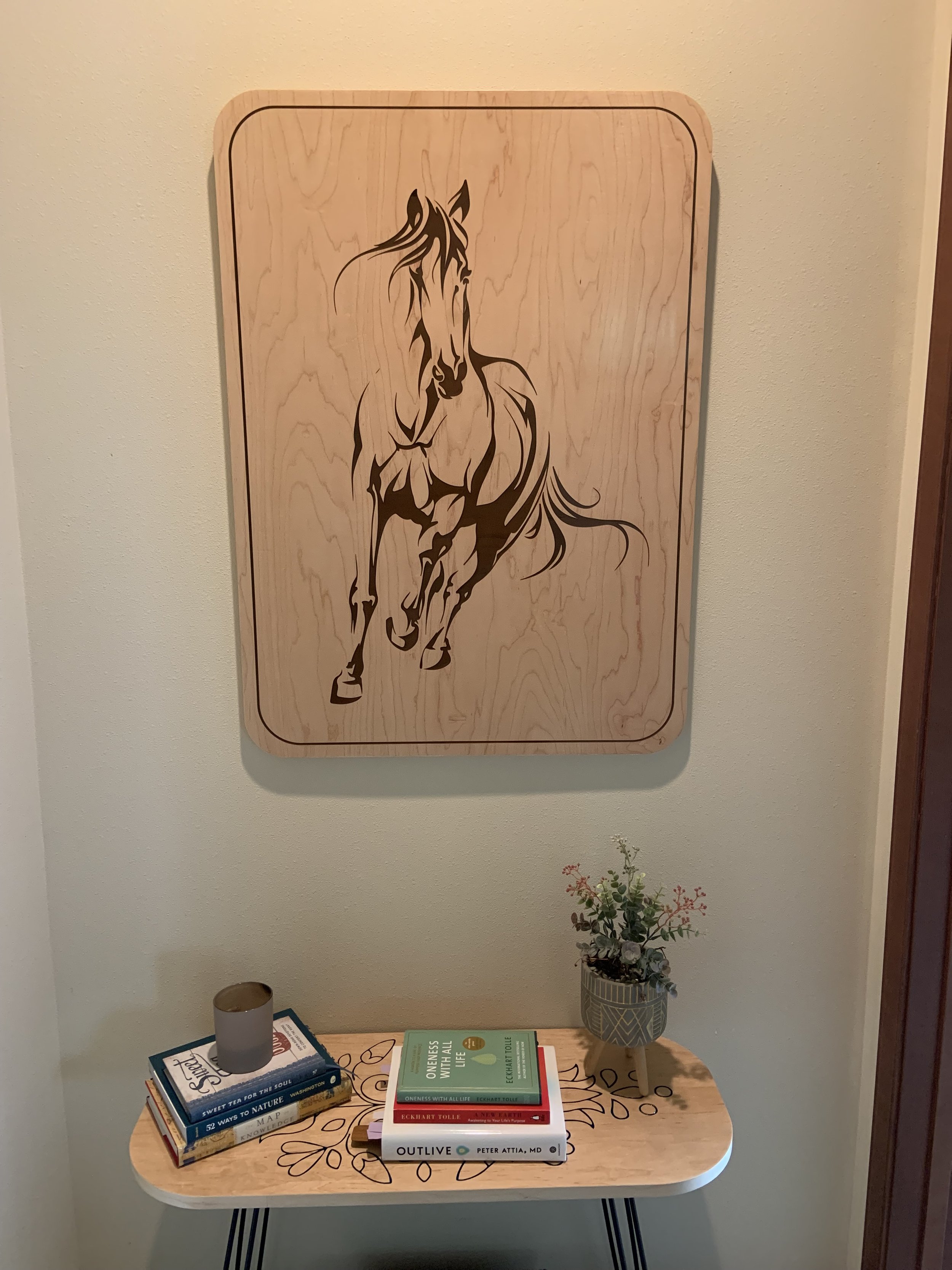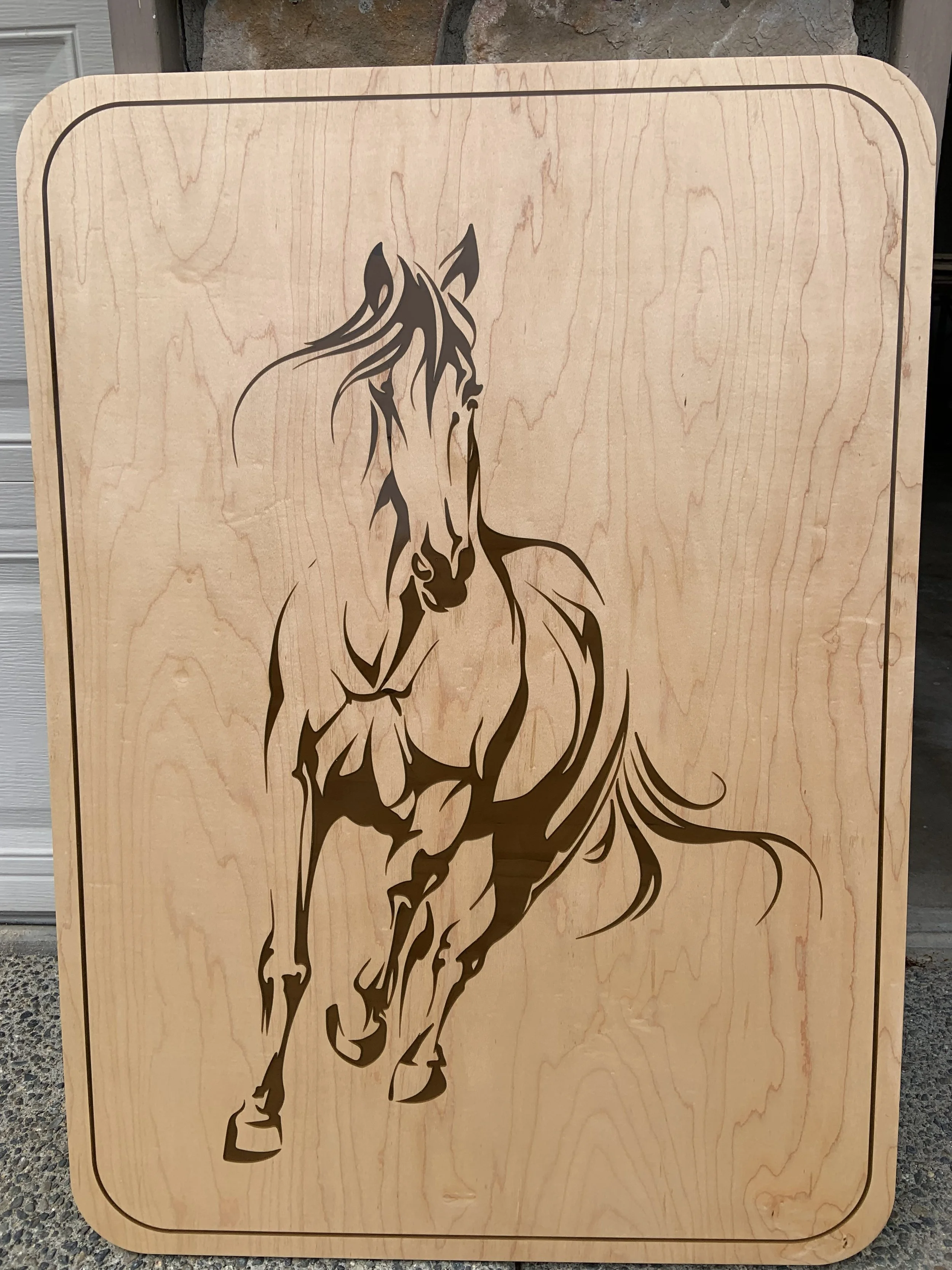 Design 2 - Running Horse (Coffee color) on Birch PlywoodThis beautiful horse art is carved out and then a coffee-colored epoxy in-lay was formed. The artwork was done on a 0.75-inch thick birch plywood.